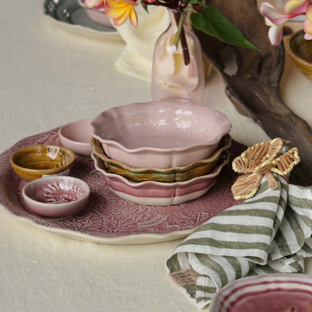 The colour palette and shapes are inspired by nature... flowers, fruits, vegetables, leaves. These hues of nature bring instant emotion and a special ambiance to the table setting.