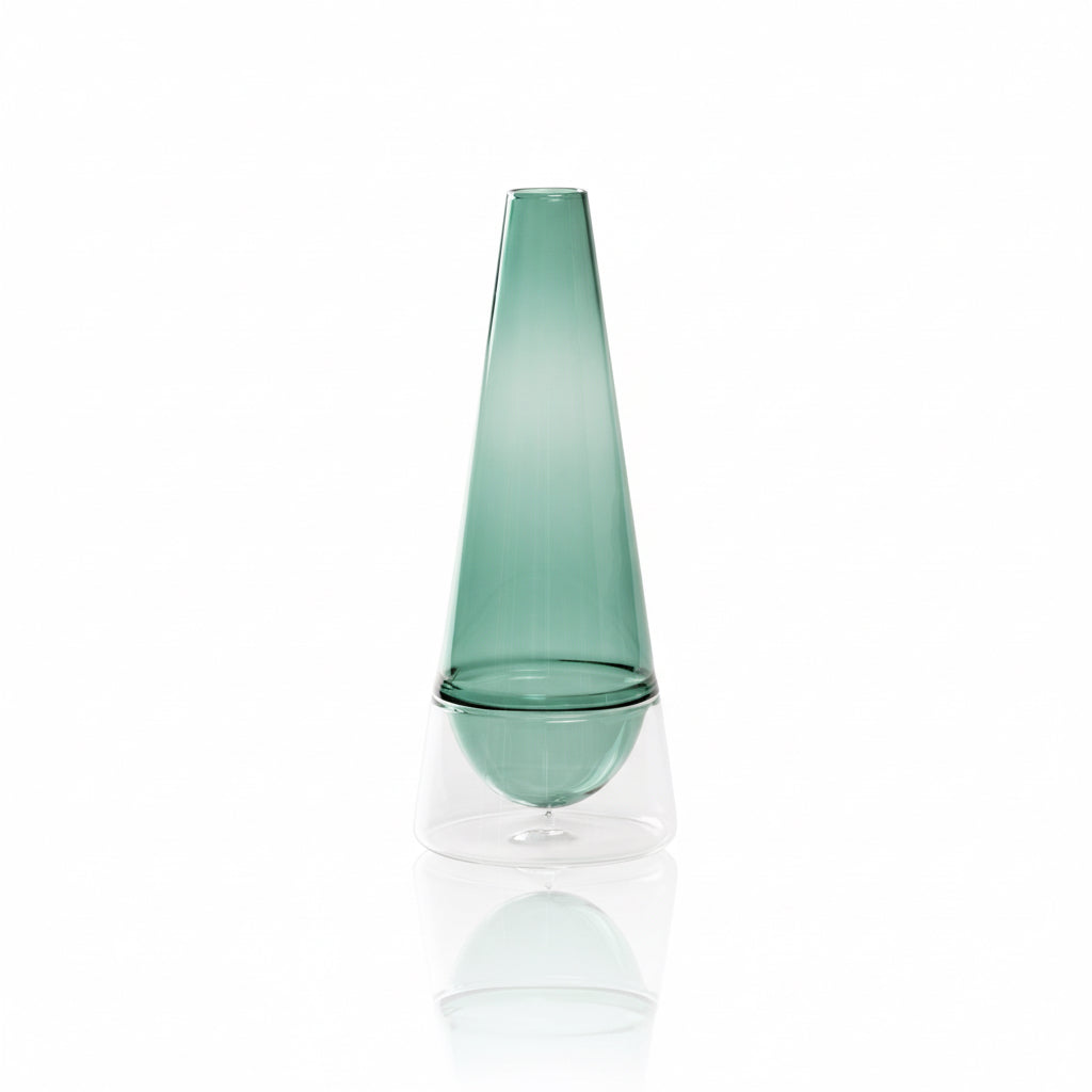 Essential lines and sophisticated transparencies define CONOSFERA, a collection of vases in hand-blown, handcrafted borosilicate glass. The design plays on the encounter of two differently colored volumes, fused together using the refined “incalmo” technique: a coloured cone that transforms into a sphere seems to float inside a transparent base, creating an effect of striking visual lightness.